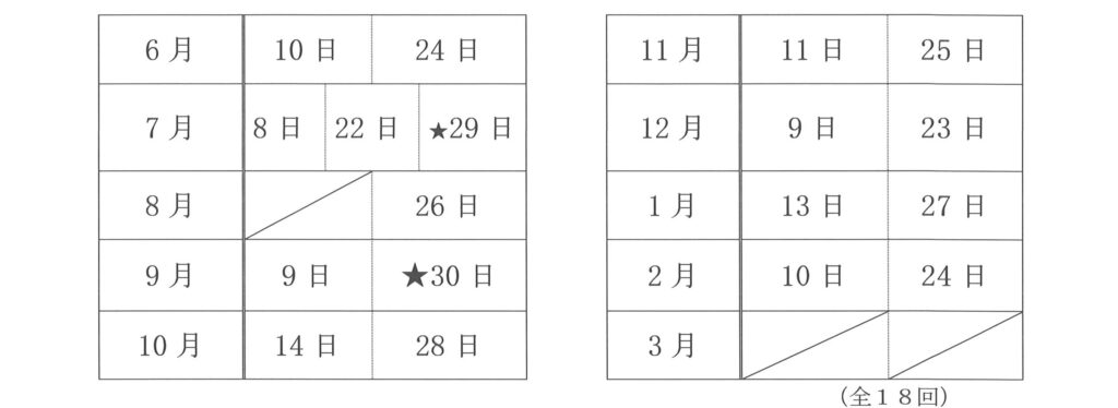 教室の目標 ・筆ペン、万年筆、ボールペン、鉛筆の中からひとつ選び、楷書、行書など美しい文字を書く。 ・書くことを楽しみながら発表会に向けて作品を作ります。 教室の詳細 日 時:第2・4水曜日 午前 10時〜12時定 員:24名場 所:高齢者生きがい活動センター(最寄り駅 南千里駅)生きがい教室1・2教材費:教材費3,240円程度(練習用ノート4冊<8マス12行縦行>440円テキストコピー代900円位、ペンなど1,200円位、発表会の材料700円位で)が必要。 令和8年度授業予定日